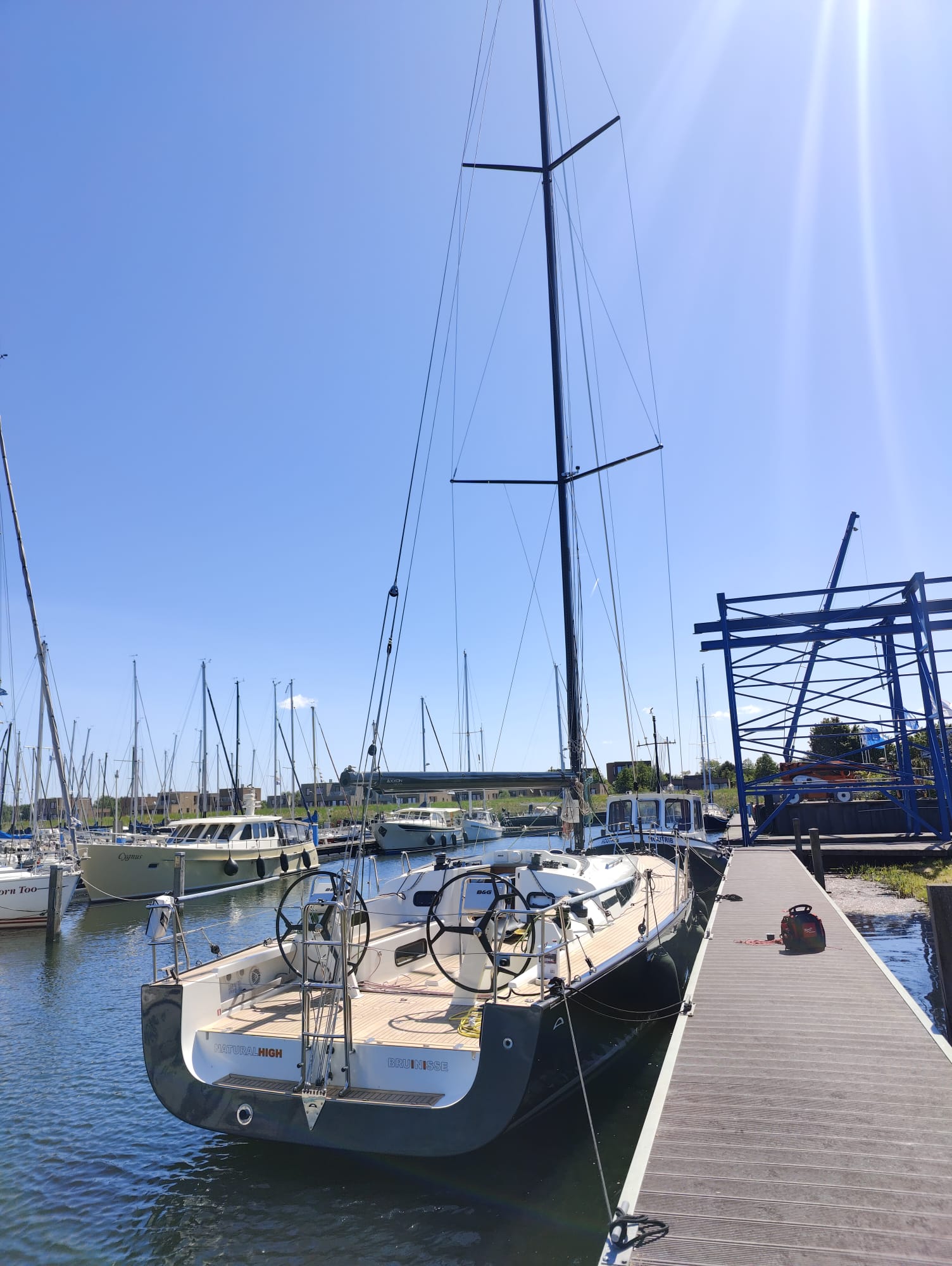 Schoonmaken, controleren en terugplaatsen van rodrigging voor een Arcona met carbon mast. Verstaging op spanning en controle van mastrake.