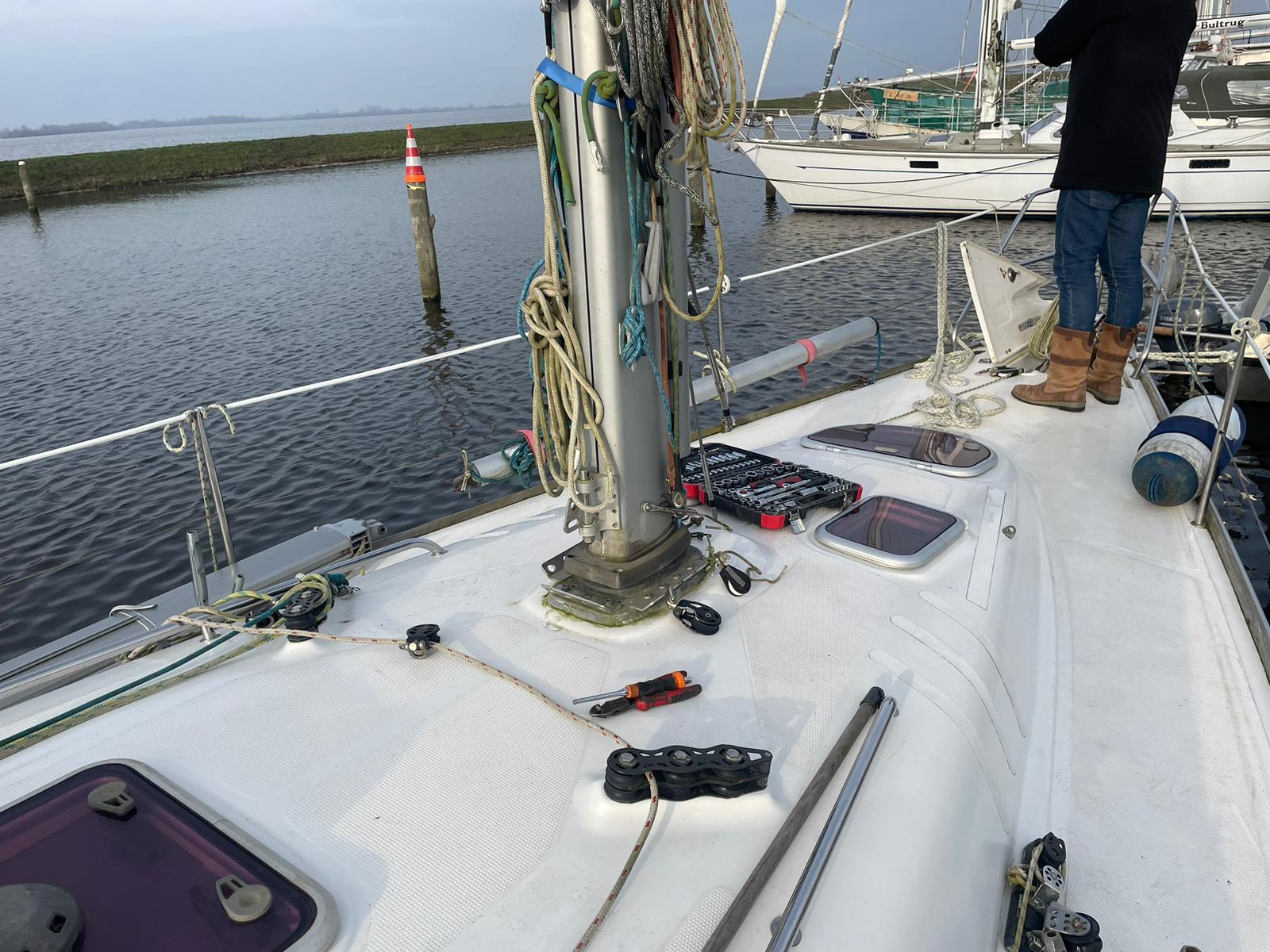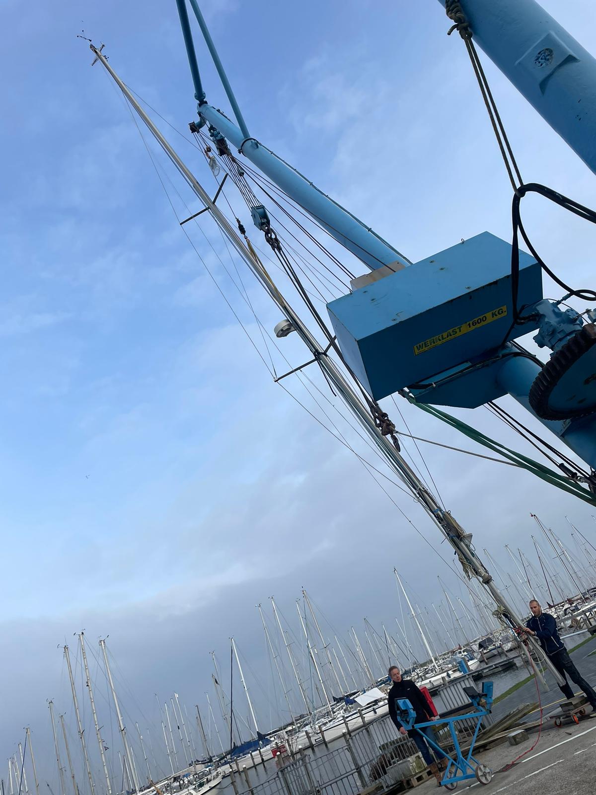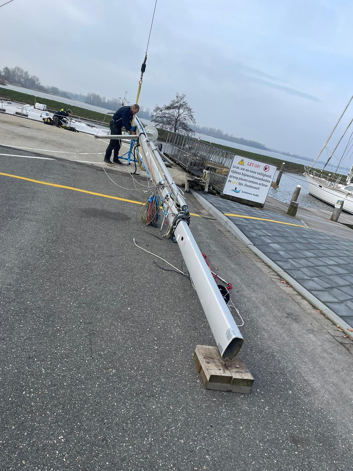 De mast is zorgvuldig gelicht, aan wal geïnspecteerd en waar nodig onderhouden. Alle verstaging en beslag zijn gecontroleerd, verbindingen beoordeeld en slijtagegevoelige onderdelen geïnspecteerd. Indien noodzakelijk zijn onderdelen aangepast of vervangen om de betrouwbaarheid te waarborgen.